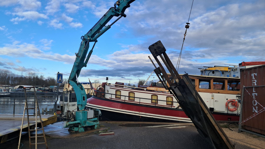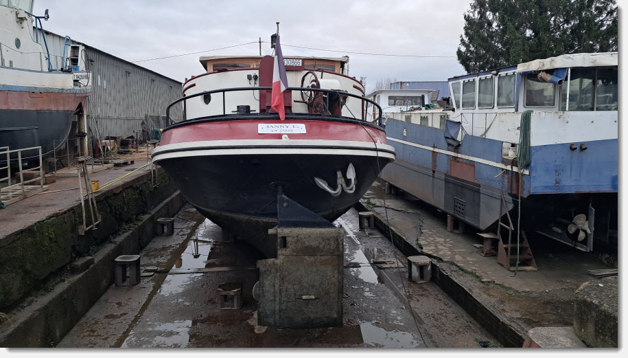 L'autre jour, le JENNY E s'est posé et est resté bloqué à l'entrée de la cale sèche car le niveau de l'eau du canal était descendu.