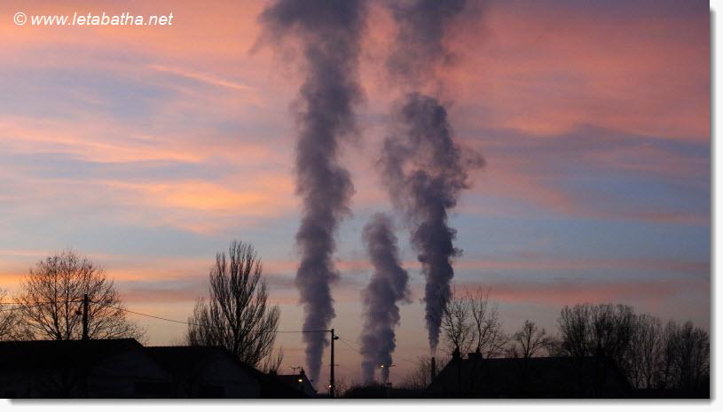 Il n'y avait pas de vent hier en fin d'après-midi. Nuage de vapeur d'eau chez Unalit qui fabrique des panneaux de bois et contreplaqué.