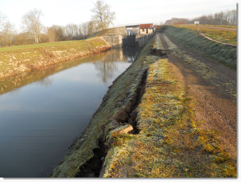 Suite à un dragage un peu trop "appuyé", le perré en rive gauche à l'aval de l'écluse de Charentenay (Petite Saône) s'est effondré. Des palplanches vont êtres battues très rapidement et ceci va avoir un coût non négligeable.