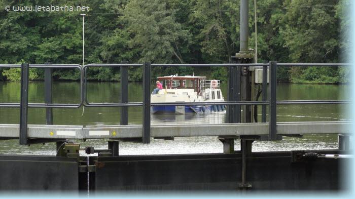 Mercredi 13 août Le mauvais temps était annoncé et il est bien arrivé dès la fin de la nuit avec de la pluie puis en fin de matinée beaucoup de vent de secteur SW avec de belles rafales. Comme nous l'avions décidé, nous avons quitté Gray ce matin mais plus tard que prévu à cause de la pluie. Vers 11h, nous larguons les amarres et franchissons l'écluse de Gray.